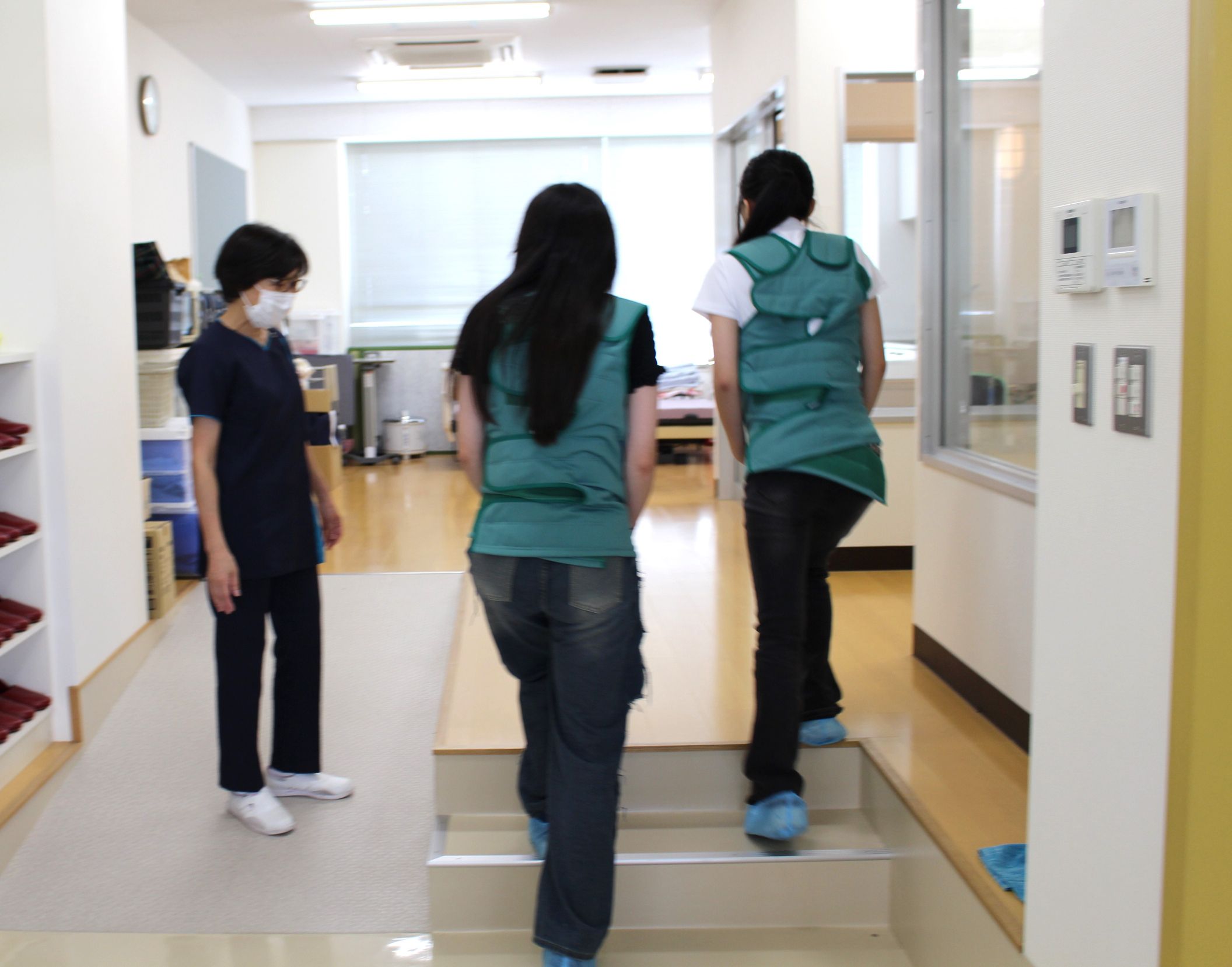 妊婦体験では、実際に装具を付けてもらい、実際に歩行や階段昇降をすることで、