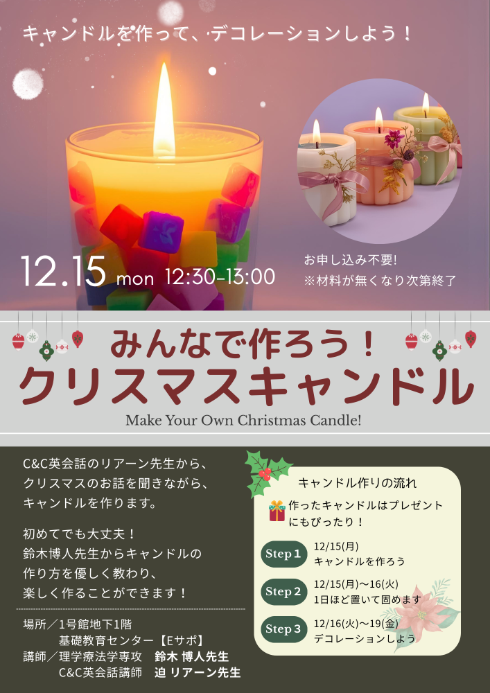 今年は、C&C英会話講師のリアーン先生からアメリカのクリスマス文化のお話を聞きながら、理学療法学専攻の鈴木博人先生のご指導のもと、キャンドル作りを体験します。