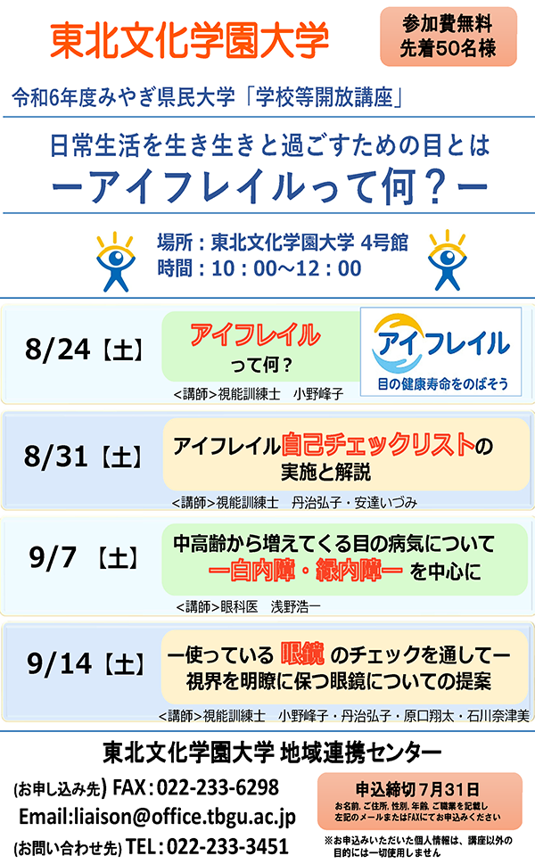 | 第1回目 | 8月24日(土) 10:00~12:00 | アイフレイルって何 | 視能訓練士 ?小野 峰子 |