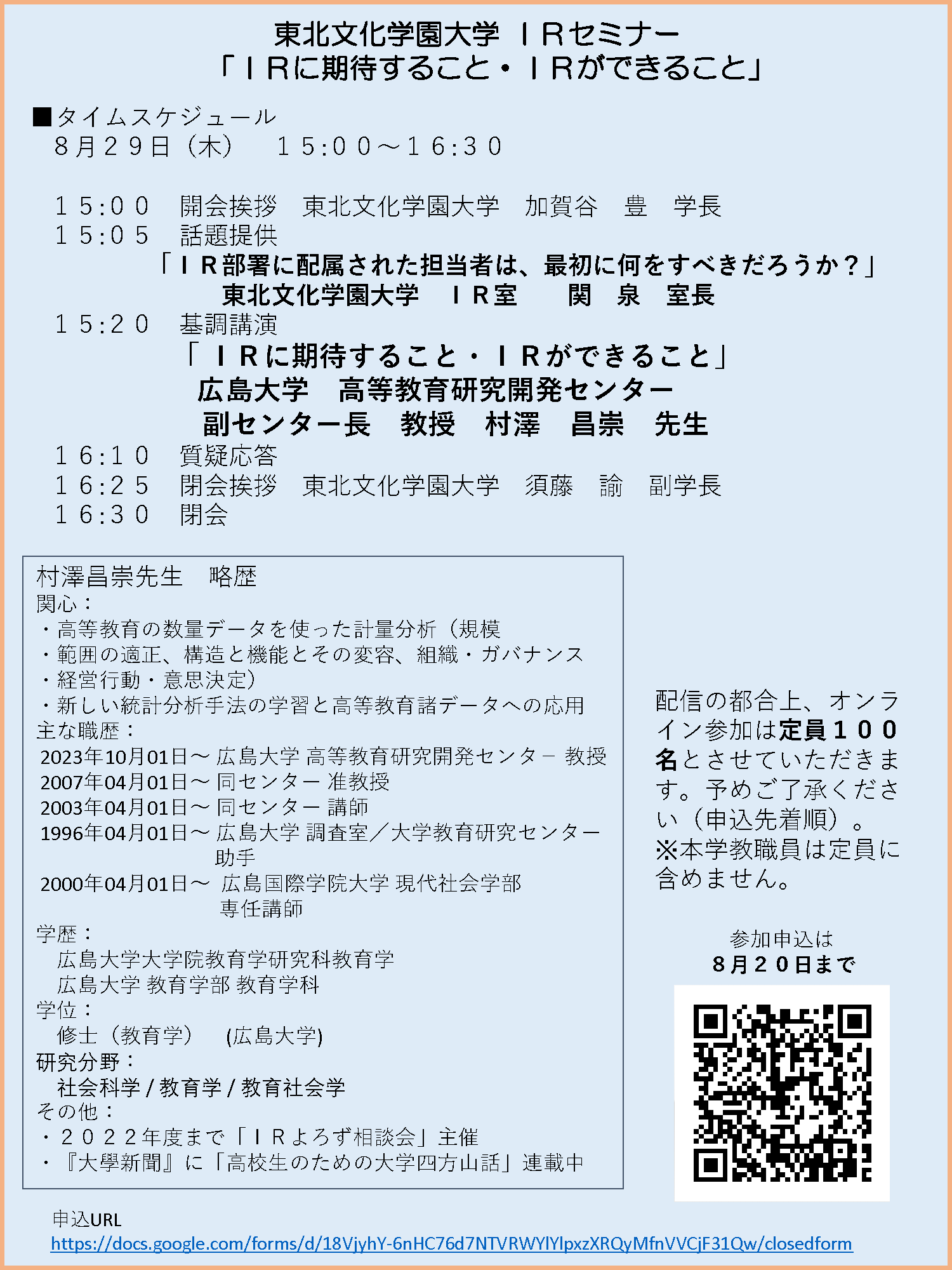 オンライン開催で参加費は無料です。他大学のIR担当者やIRに興味のある方も参加自由ですので、ご興味のある方は下記アドレスよりお申し込みください。(先着100名様まで)