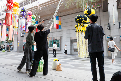 今年は「夜空?三日月?満月?星」をイメージした4基の七夕飾りを学生リーダー会が制作しました。