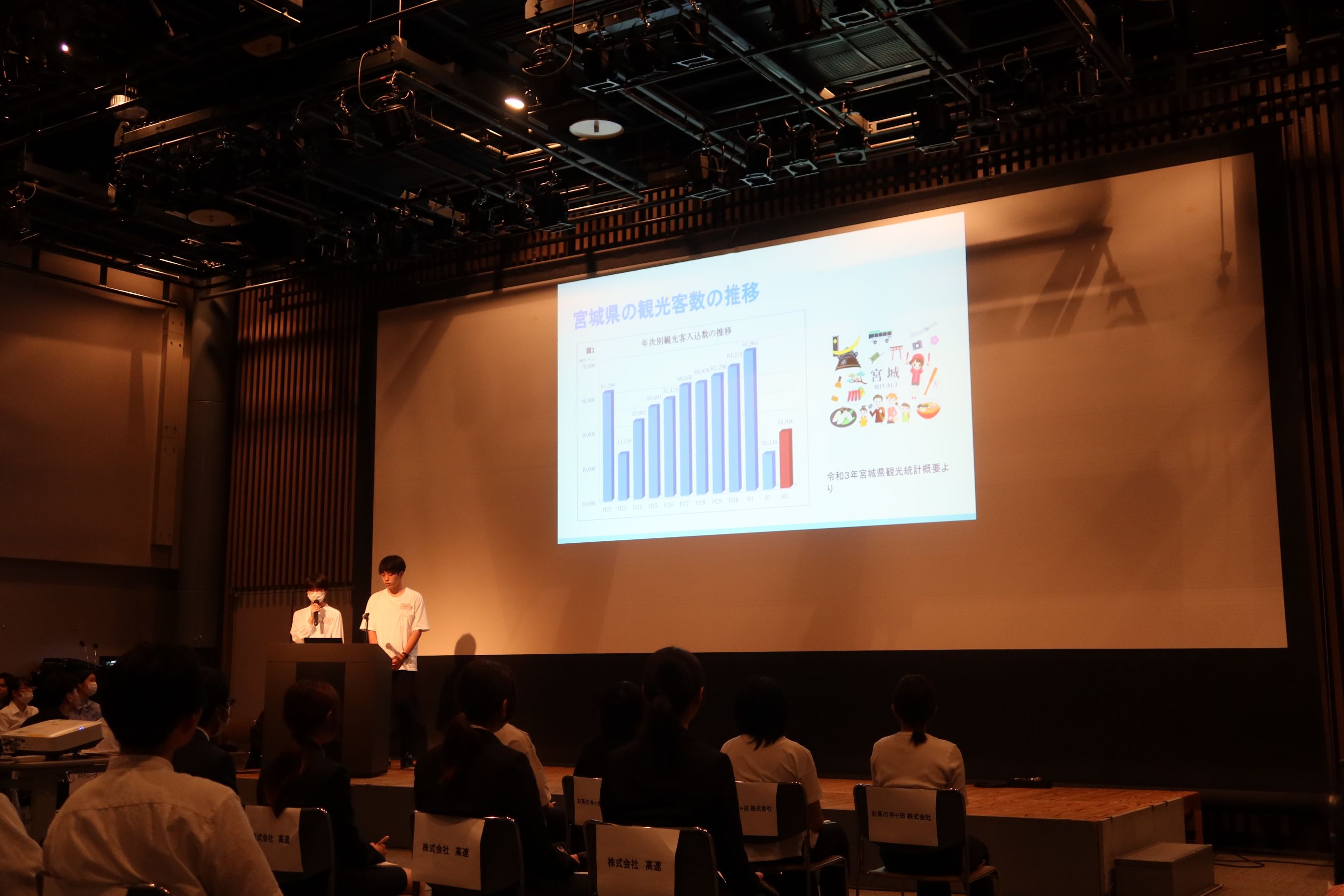 2023年8月8日(火)~9月15日(金)に開催された、JIMOTOコラボインターンに本学学生6名(経営法学科3年5名、現代社会学科2年1名)が参加しました。本年度で5年目の開催となる本インターンシップは、地元企業で働く魅力を知るきっかけとして、宮城県内企業13社が共同開催している課題解決型の長期インターンシップです。昨年に引き続き、取り組み内容は「担当企業の事業や強みを活かして、地域のミライをより良くするアイデアを構想する」でした。参加学生達は各企業に2~4名ずつ配属された後、店舗?工場見学や経営者?社員インタビューを経て、他大学の学生とともに約1か月間グループワークでアイデアを磨き、プレゼン資料作成に取り組みました。