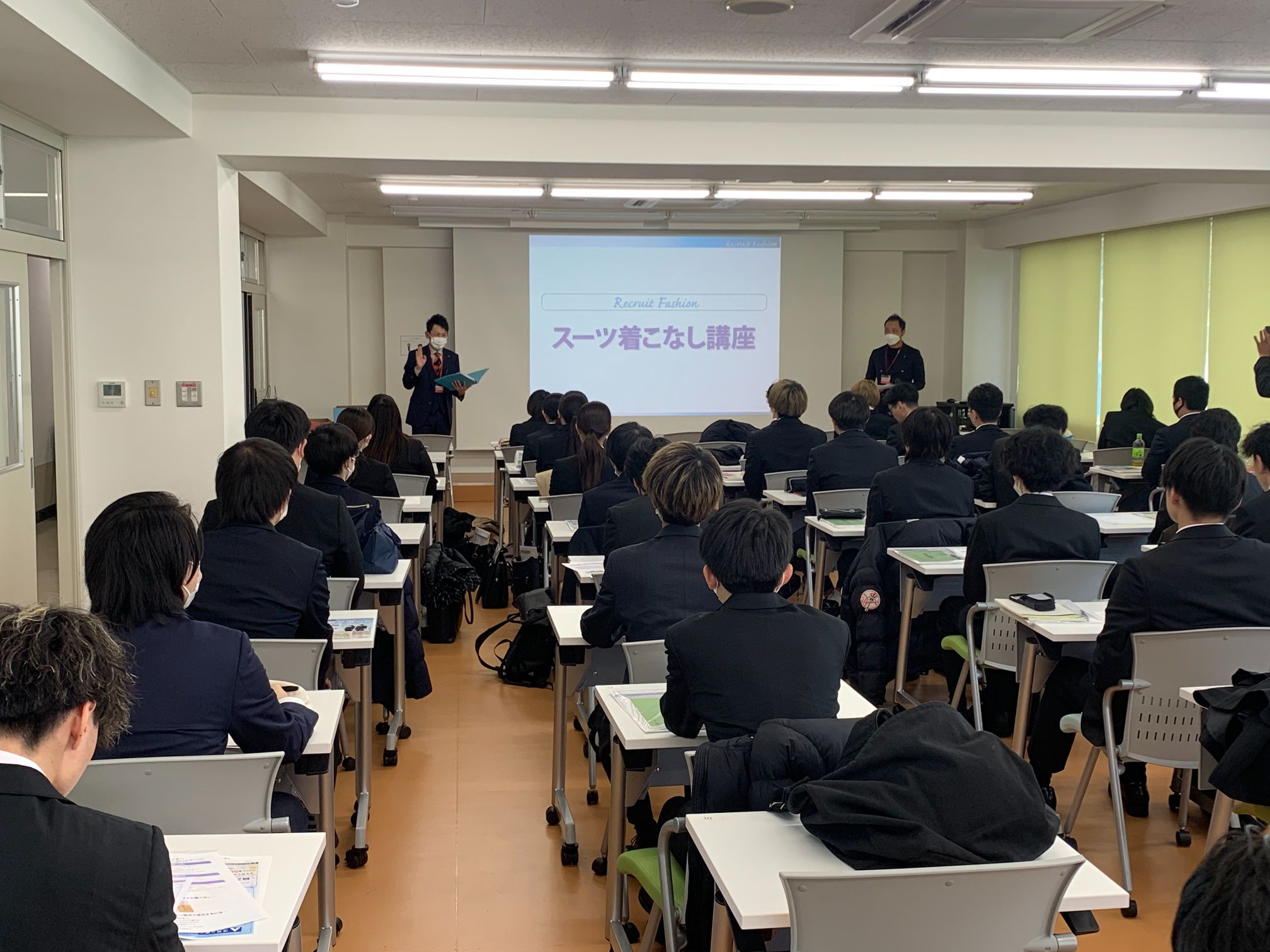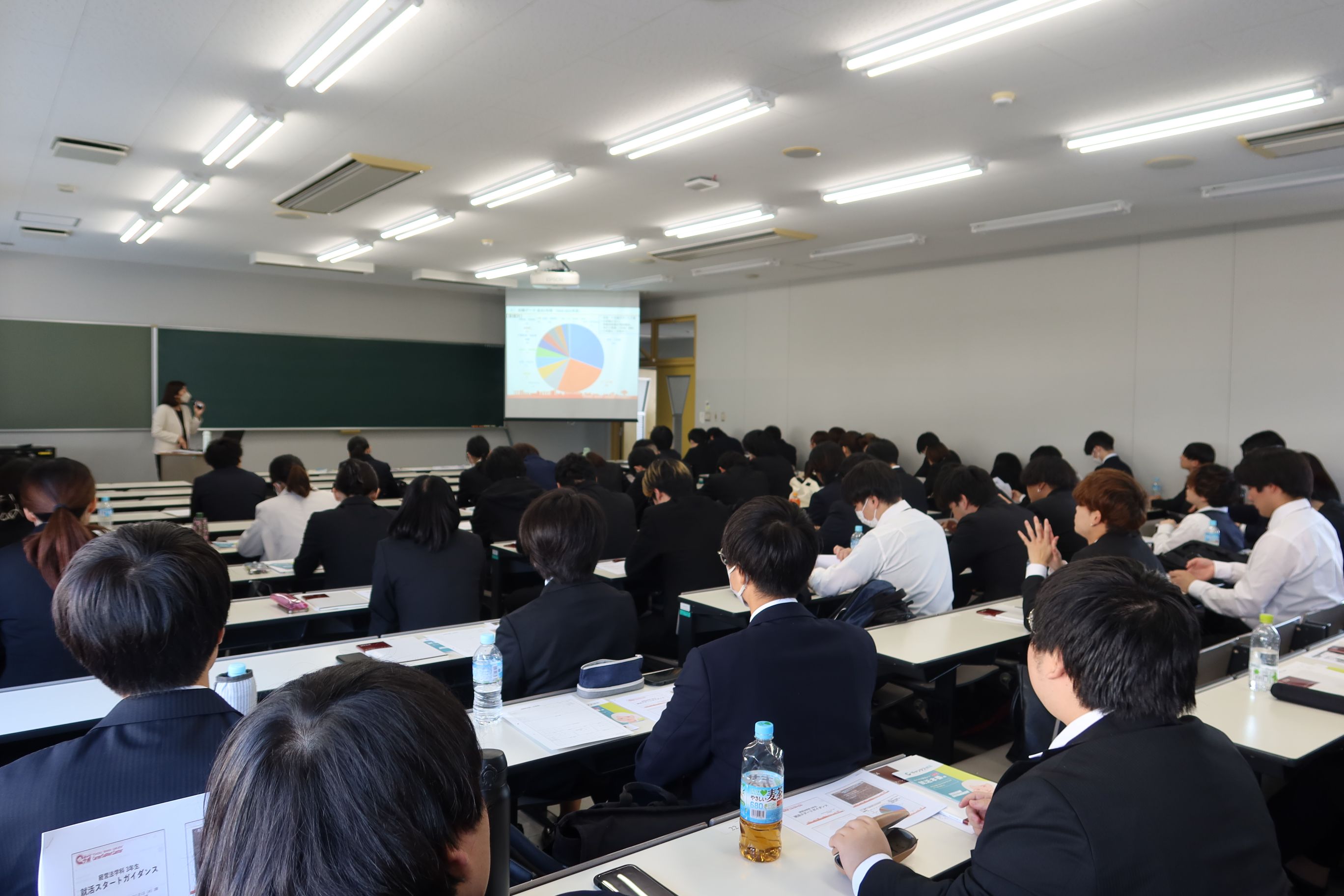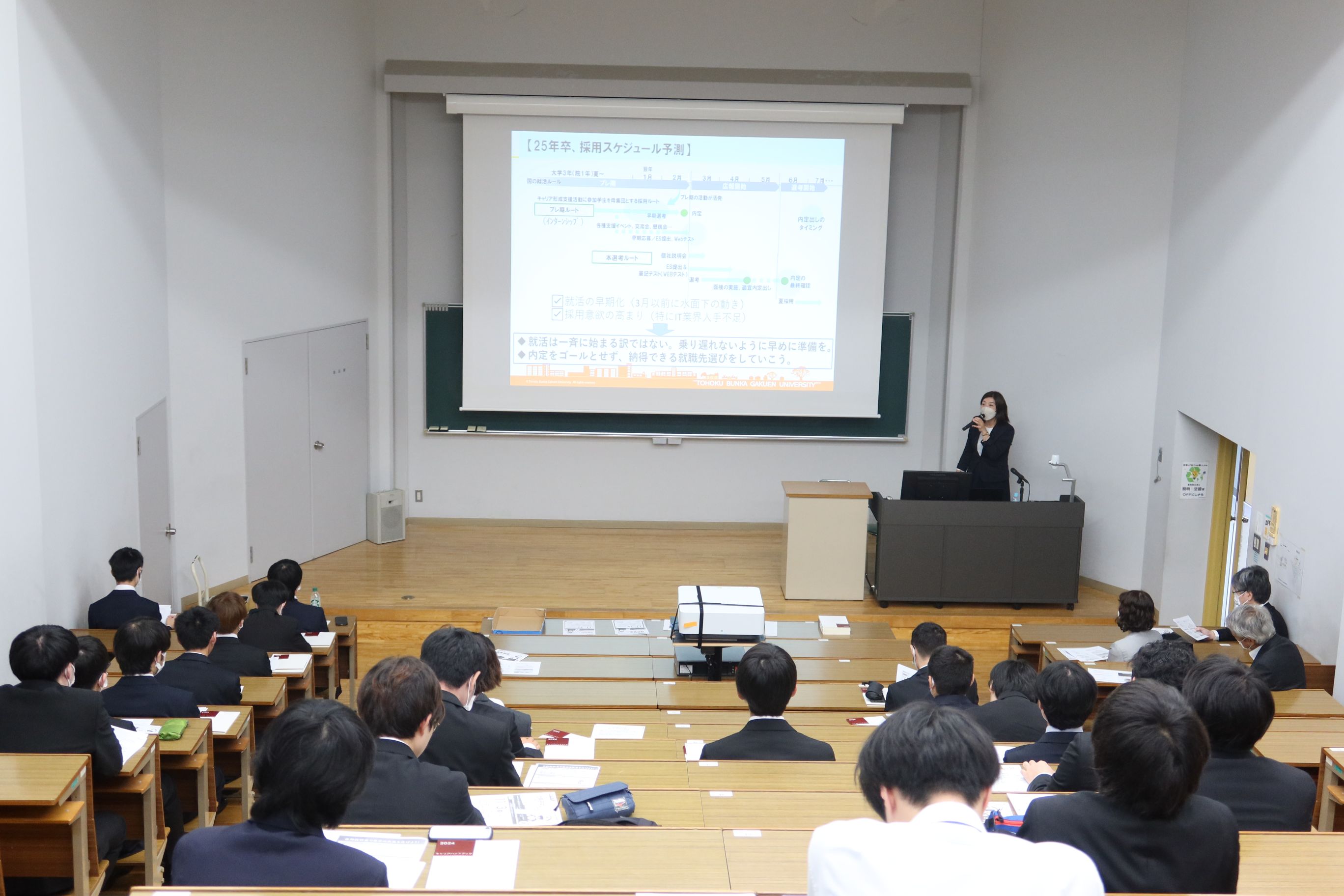 2023年10~11月にかけて、民間企業総合職や公務員を目指す4学科(現代社会、経営法、知能情報システム、建築環境)の3年生を対象に『就活出陣式(キックオフ)」及び「就活ガイダンス」を実施しました。各学科毎に、先輩の就活体験談や昨今の業界動向や就活概況を伝えることで、今後本格化する就活に向けてどう行動していけばよいかイメージし、意識を高める機会としています。学生達はリクルートスーツに身を固め、真剣に耳を傾ける様子が見られました。