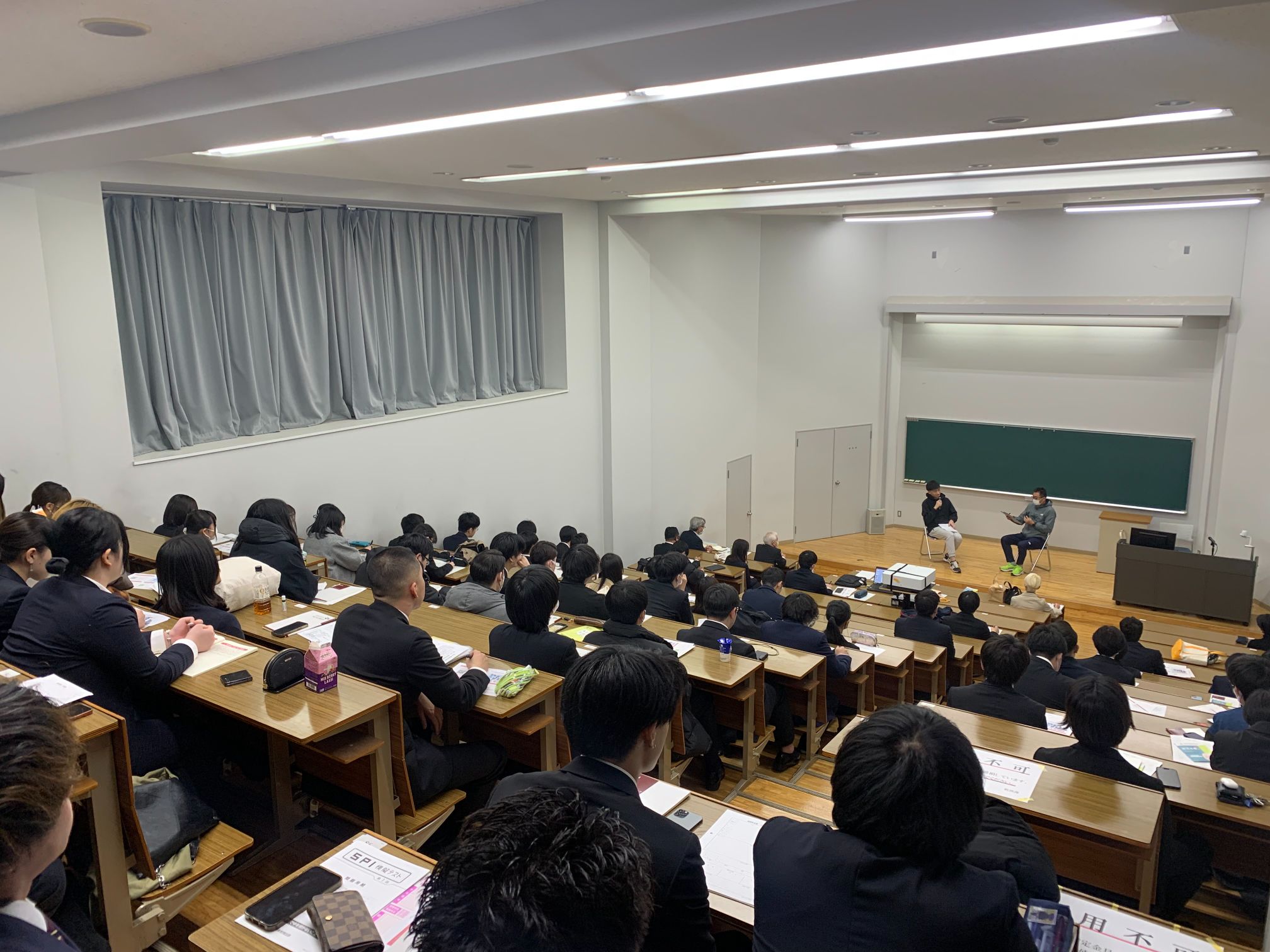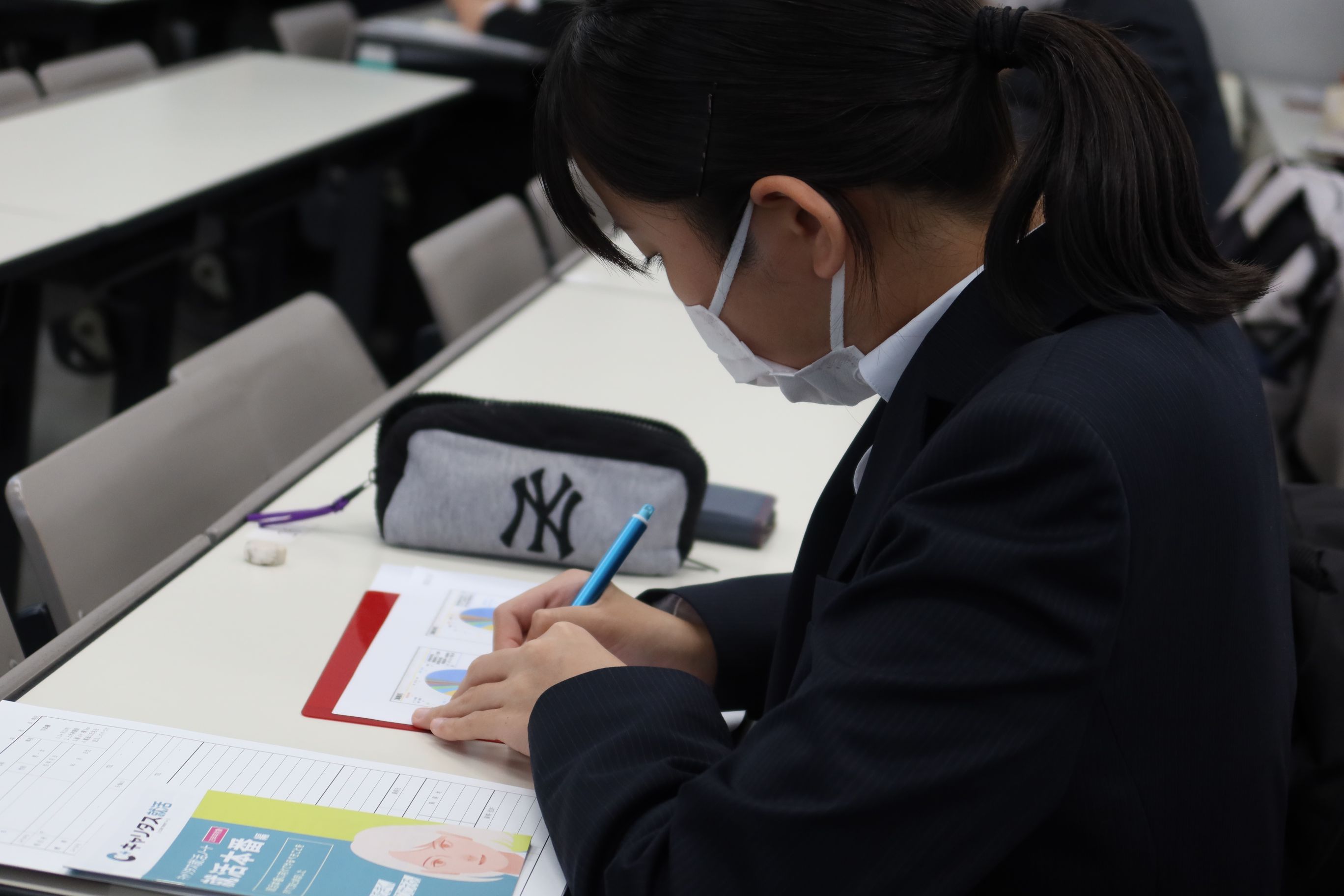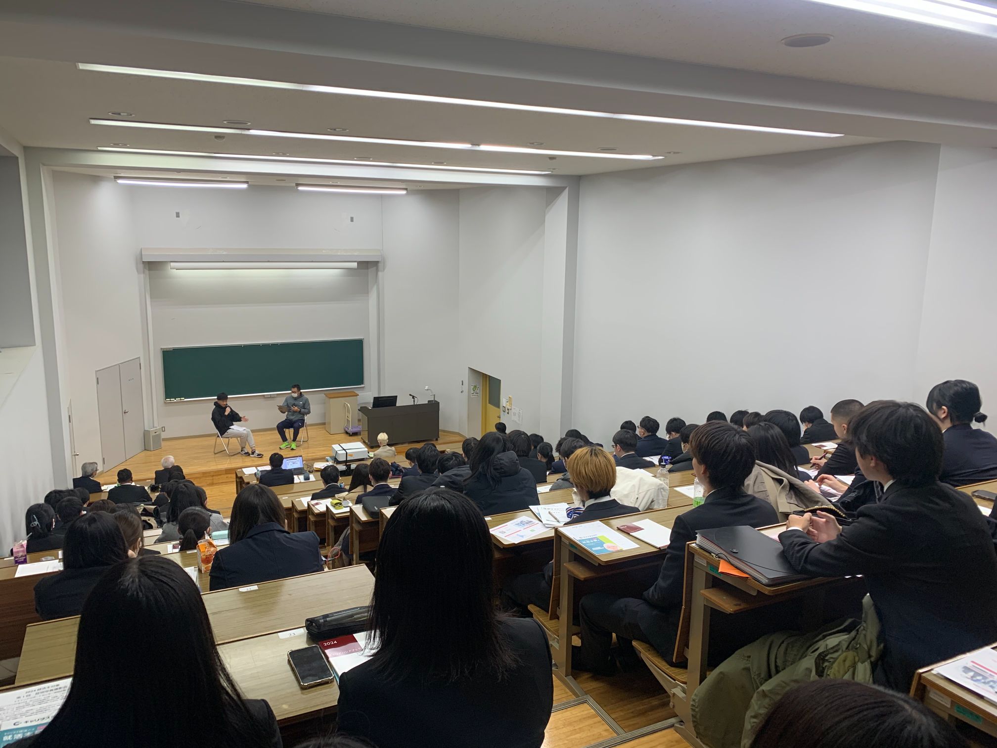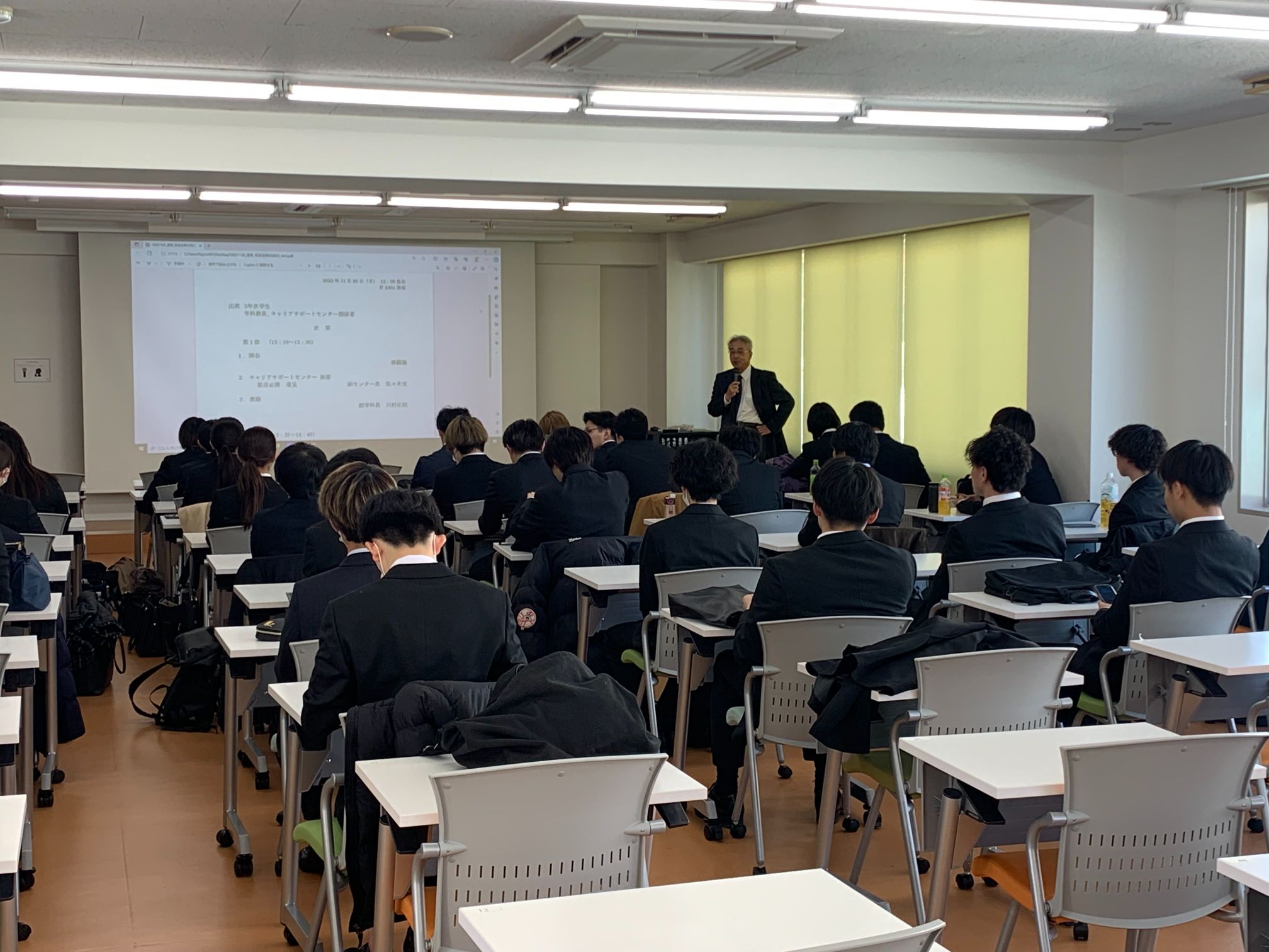 2023年10~11月にかけて、民間企業総合職や公務員を目指す4学科(現代社会、経営法、知能情報システム、建築環境)の3年生を対象に『就活出陣式(キックオフ)」及び「就活ガイダンス」を実施しました。各学科毎に、先輩の就活体験談や昨今の業界動向や就活概況を伝えることで、今後本格化する就活に向けてどう行動していけばよいかイメージし、意識を高める機会としています。学生達はリクルートスーツに身を固め、真剣に耳を傾ける様子が見られました。