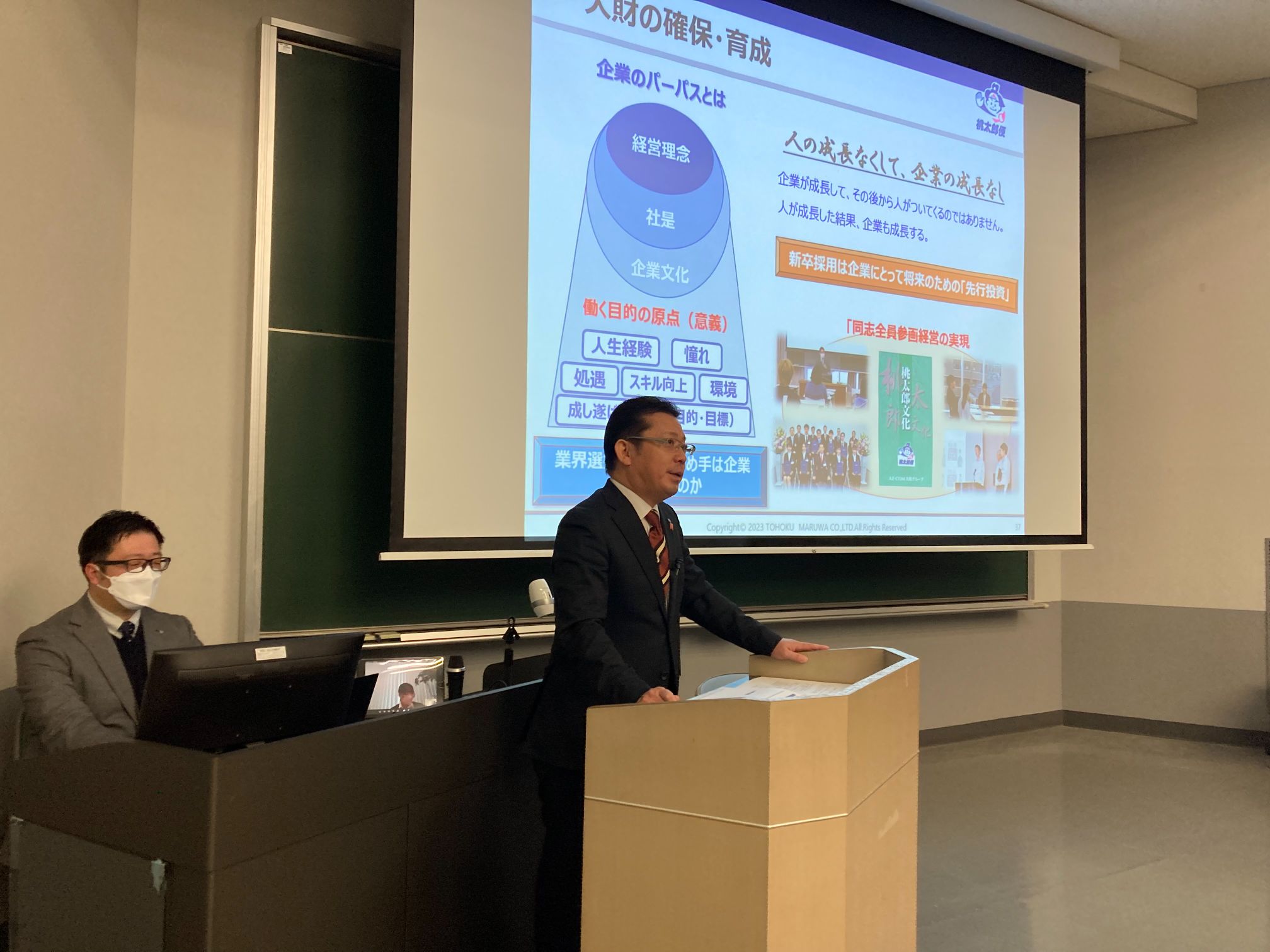 現代社会学科2年「キャリア形成Ⅲ?Ⅳ」の科目では、夏季(8月~9月)に行った2~5日間の就業体験の振り返りと自身のキャリアを考える上での業界?職種研究の一環として、仙台市を拠点とする事業所の経営者、人事担当者、卒業生の方々にご講話いただきました。