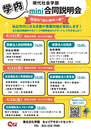 現代社会学部3?4年の就活サポートとして、学生自身のキャリアプラン「医療機関で働くこと、社会福祉施設で働くこと」をより具体的にイメージして、就活をすすめていくことを目的に『現代社会学部 学内mini合同説明会』を実施しました。