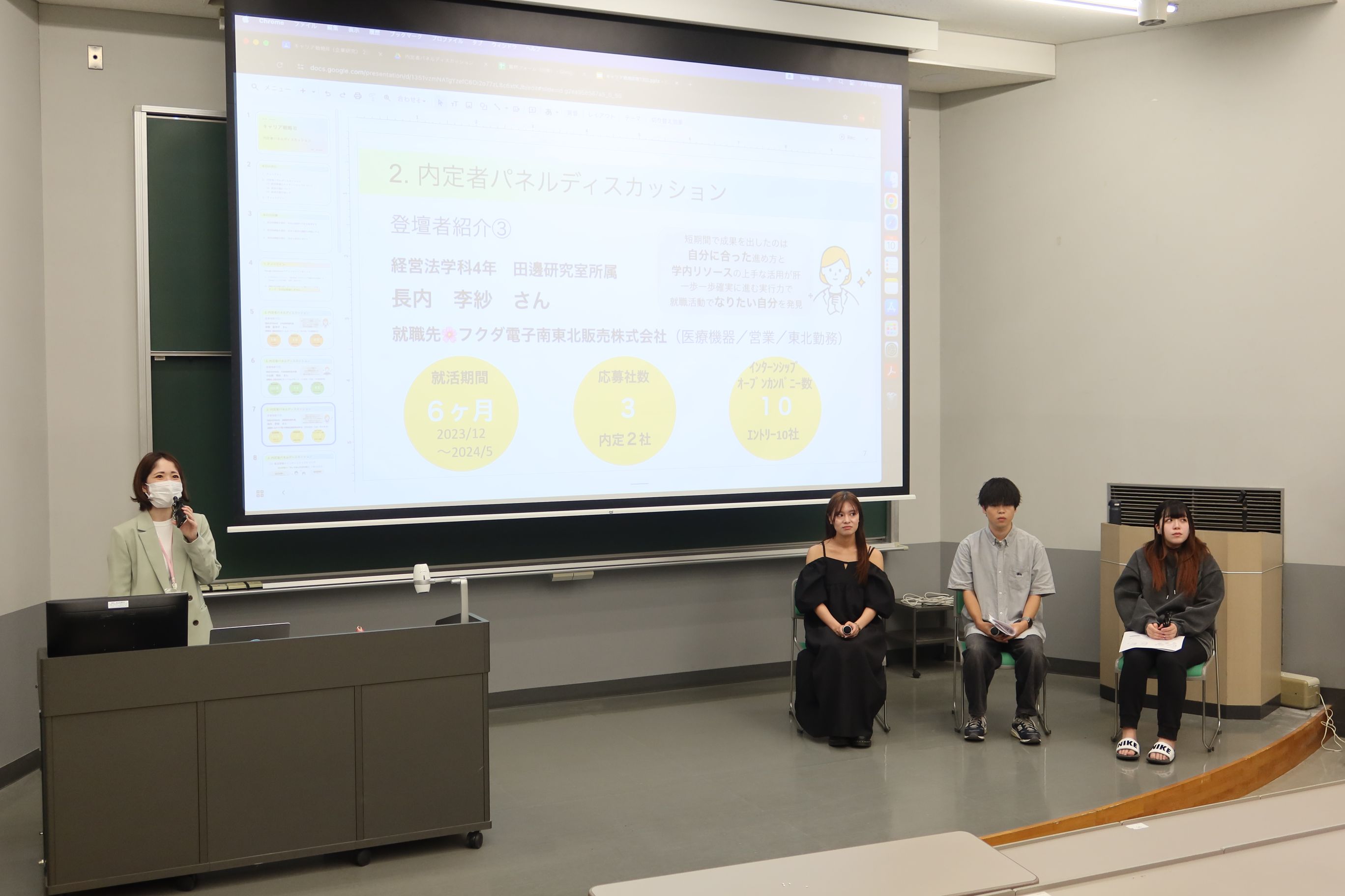 「インターンシップや説明会等にとにかく足を運んだ。ネットでは得られないリアルな情報が入ってきて軸が定まった」「少しでも興味を持てる会社があれば壁が大きくてもチャレンジして欲しい」「活動が遅れて焦りがあったが、一人で抱え込まず先生やキャリサポへ相談し乗り超えた」など、体験者ならではのリアルな受け答えや先輩からの熱いメッセージがあり、学生たちは話に聞き入る様子が見られました。