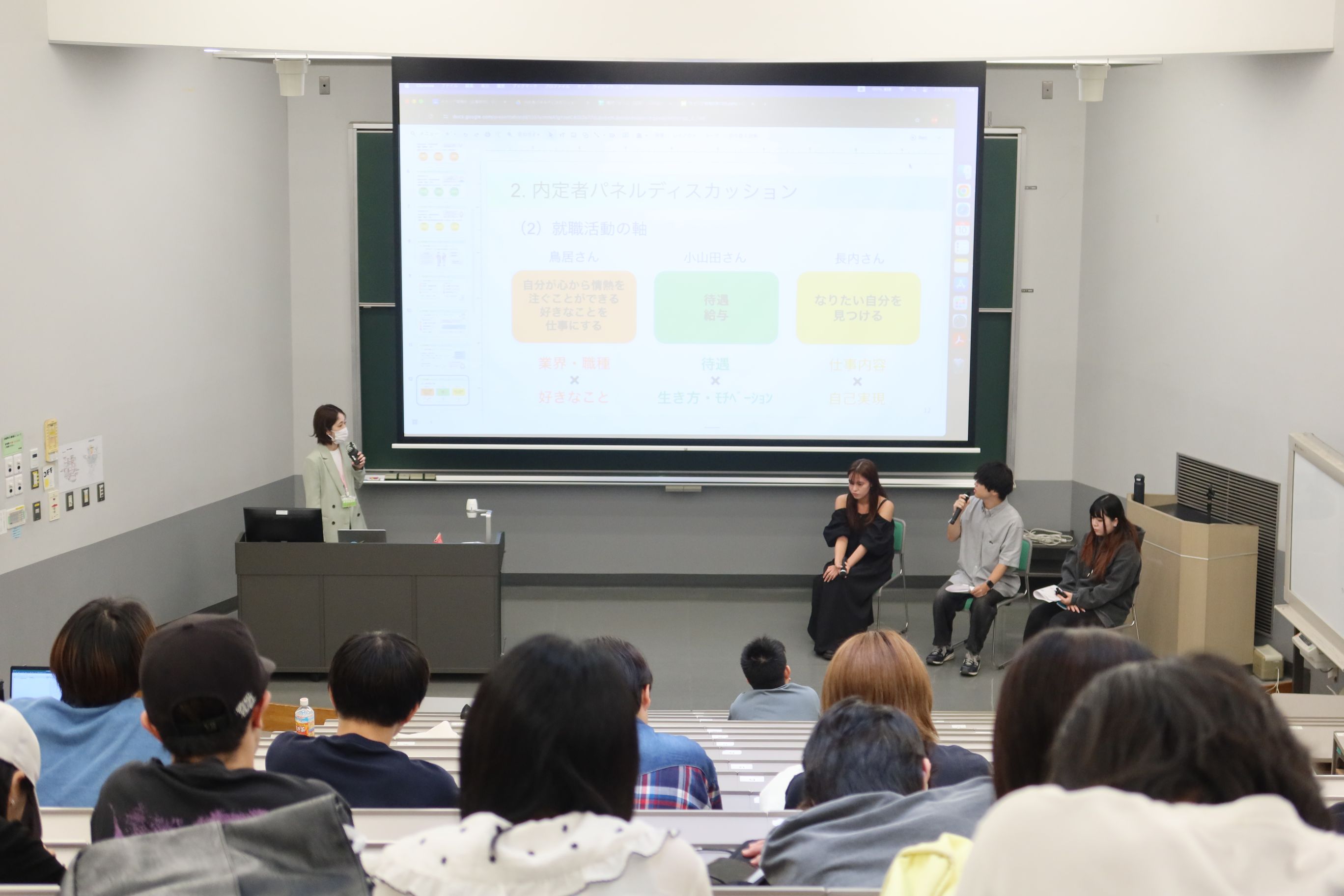 主に『就活準備とインターンシップ』『就活の軸』『就活を振り返って』の3点について、講師からのインタビューをもとに進んでいきました。希望業種や職種、就活期間や応募社数も異なるメンバーが集まり、後輩たちに向けて就活体験談を披露してくれました。