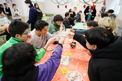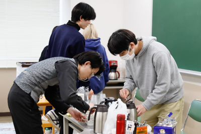 2月11日(水)、増井ゼミ2~4年生が学内で一日限定の「カフェポレポレ」をオープンしました。このカフェプロジェクトは、2017年度に本学セブンイレブンとの共同企画としてスタートし、今年で7年目を迎えます。今年度は時間割の違いによるスケジュール調整や情報共有の難しさといった課題を抱えながらも、2?3年生の統括を中心に、各部署のチーフやゼミ生たちが試行錯誤を重ね準備を進めてきました。対面で話す機会が限られる中、不安を抱えつつ迎えた本番当日でしたが、ゼミ生たちは笑顔で協力し、閉店まで多くの学生や教職員で賑わい大盛況となりました。
