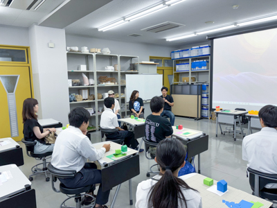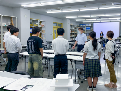 模擬授業では、「展開図を展開する」と題して体験授業を行い、参加学生が建築模型をつくりました。