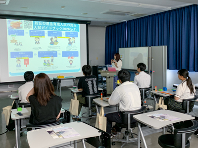 模擬授業後に、二科先生より入試説明を行い、在校生との学生生活の実態を紹介する懇談会を実施いたしました。