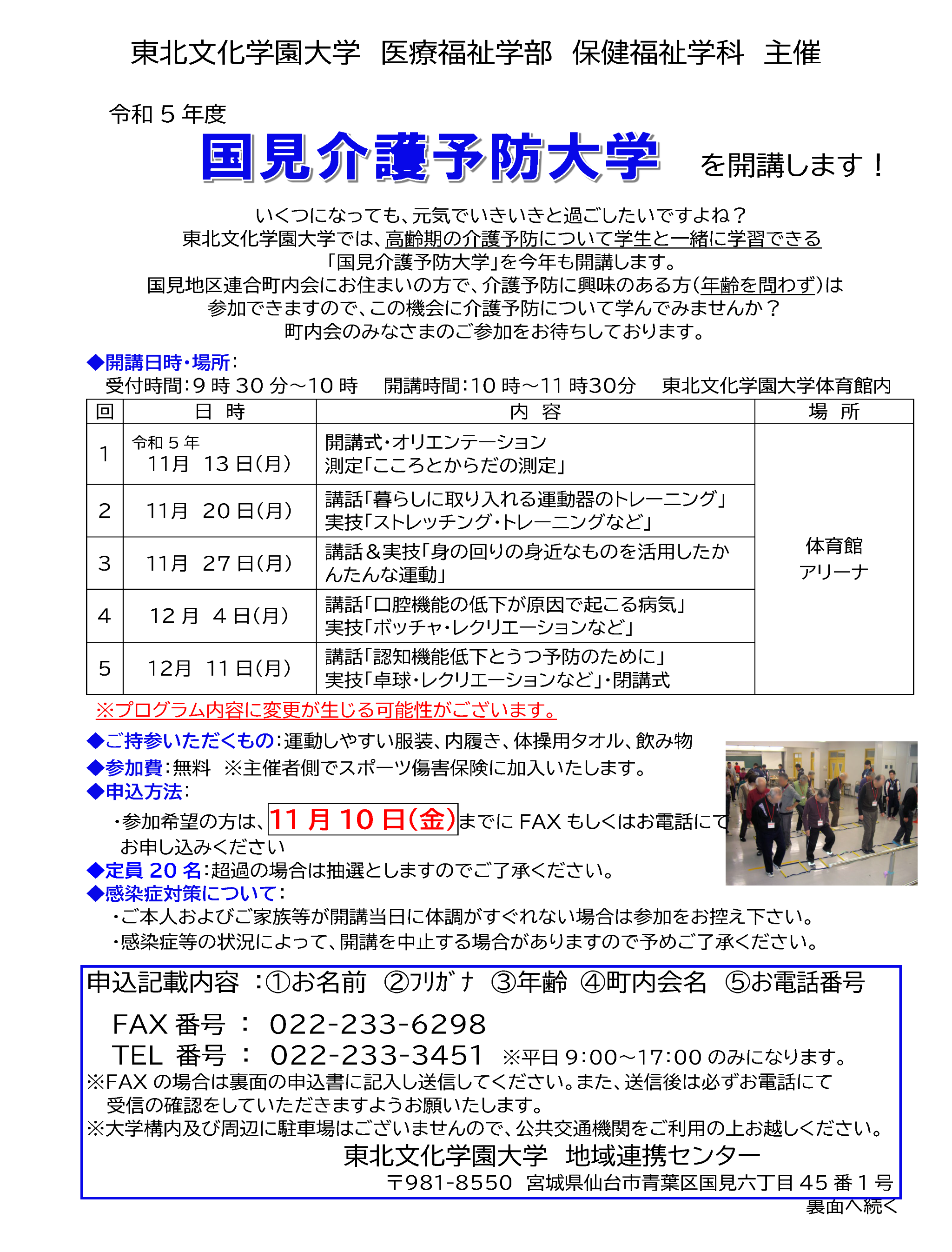 東北文化学園大学では、高齢期の介護予防について学生と一緒に学習できる「国見介護予防大学」を今年も開講します。国見地区連合町内会にお住いの方で介護予防に興味のある方は年齢を問わずどなたでも参加できますので、この機会に介護予防について学んでみませんか?